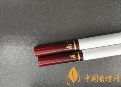 從盒子里面抽出兩支煙來,放置于桌上,觀之,煙嘴的顏色和煙盒的顏色也是一樣,采用了漸變色,紅褐色的煙嘴中間有兩排不怎么明顯的降焦孔。煙嘴的長度為32毫米,而整個煙支的長度還是普通的84毫米。煙嘴下部有南京二字和印有古都兩個字的印章圖案。一道閃閃發光的金箍環繞著整個煙嘴。