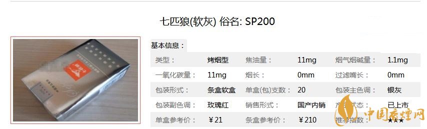 七匹狼軟灰亦稱七匹狼(SP200),精選國內(nèi)外優(yōu)質(zhì)烤煙,人工片選精華,運(yùn)用國際先進(jìn)的無氟及過濾技術(shù)、HXD烘絲工藝,由全新的國際一流廠房和設(shè)備精工制作,氣質(zhì)卓越優(yōu)雅,品味自然純正,煙草本香流露無遺,是比較經(jīng)典的具有較高性價(jià)比的狼煙。經(jīng)香煙網(wǎng)小編市場調(diào)查七匹狼軟灰售價(jià)為21元/包。