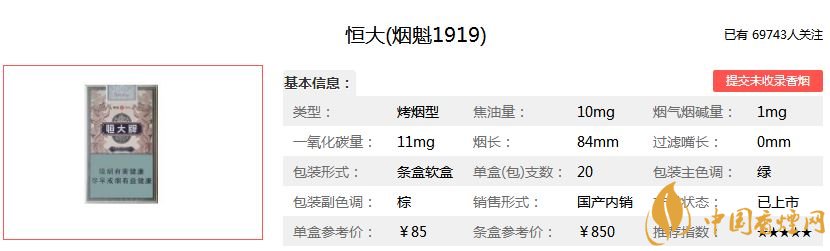 煙魁1919多少錢一包 恒大煙魁1919香煙介紹