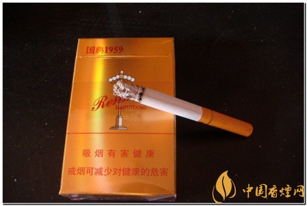 打開煙盒,首先看到的是錫紙上國典1959字樣。靠近一聞,挺清爽的煙草香,帶點涼清酸爽的氣味。手捏煙支,感覺充實,煙絲的色澤鮮艷。過濾嘴是金黃色的,上有““人民大會堂”的字樣。過濾嘴裙帶處有一道白金色的金箍,金箍下是“國典1959”字體。