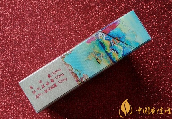 盒右側(cè)標注著明確的理化值,1.0mg煙氣煙堿量,10mg焦油量,10mg煙氣一氧化碳量,上端印有夢幻般的江南風(fēng)景圖案,風(fēng)格獨特,特別的討喜,以年輕人的審美觀來看,非常有檔次和個性,有一種獨特的韻味。