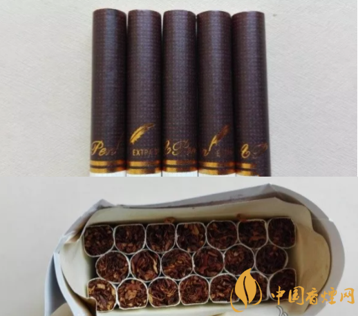 從底部開包,煙支呈7-6-7形式排列,泰山壹枝筆香煙煙嘴水松紙呈咖啡色,色彩沉穩厚實,其上印有紅色的點狀紋飾,比較雅致,金色的壹枝筆logo和英文名稱環繞一周,比較奢華。