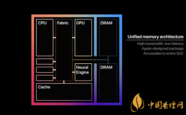 它與iPhone和iPad里面的蘋果芯片非常相似,只是功能更強大。它利用了蘋果公司的統一內存架構(UMA),這意味著全部內存(DRAM)與需要訪問內存的各種部件(比方說CPU、GPU、圖像處理器以及神經引擎)都是在同一塊芯片上。其結果是,整塊芯片都可以訪問數據,而不需要在不同部件之間復制數據,也不需要進行互連。對內存的訪問有著極低的時延與極高的帶寬。其結果是更低功耗、更好性能。