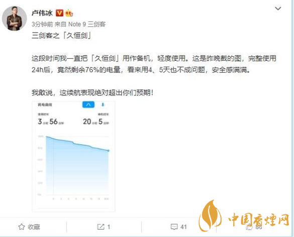 盧偉冰表示,Redmi Note 9系列久恒劍完整使用24h后,竟然剩余76%的電量,看來用4、5天也不成問題,安全感滿滿。