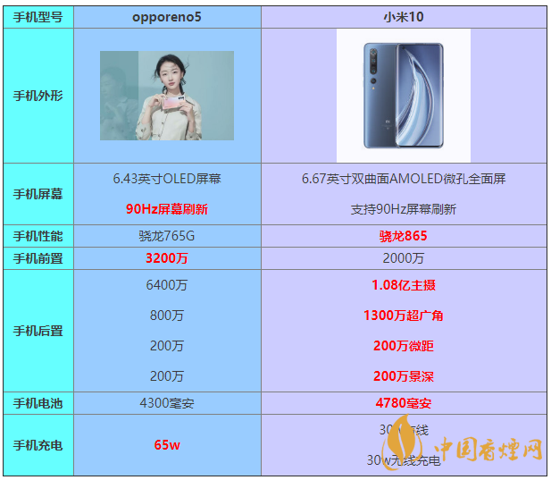 一、opporeno5和小米10參數對比