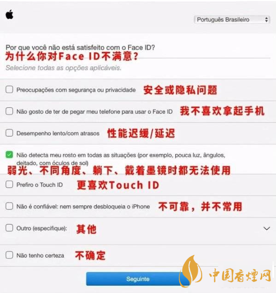 它詢問了用戶對Face ID的滿意度,如果不滿意的話,問卷里會給出幾個選項,要求用戶選擇原因。