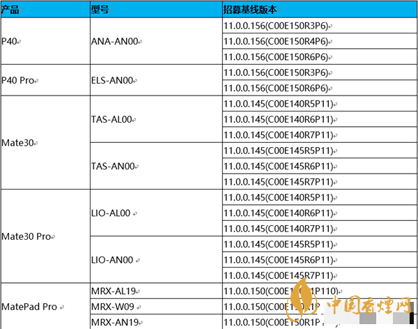 全網(wǎng)通(5G雙卡)P40 、 全網(wǎng)通版P40 Pro、Mate30、Mate30(5G) 、Mate30 Pro、Mate30 Pro(5G),型號(hào)清單為ANA-AN00、ELS-AN00、TAS-AL00、TAS-AN00、LIO-AL00、LIO-AN00 。