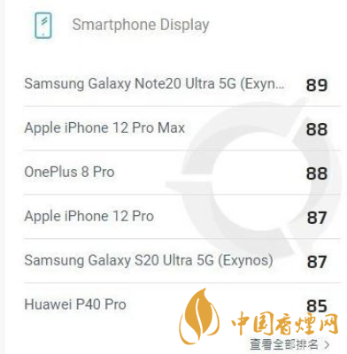 iPhone 12 手機的屏幕表現,最終,以88分與一加8 Pro并列第二,列位榜首的目前是Note20 Ultra,分數為89分。