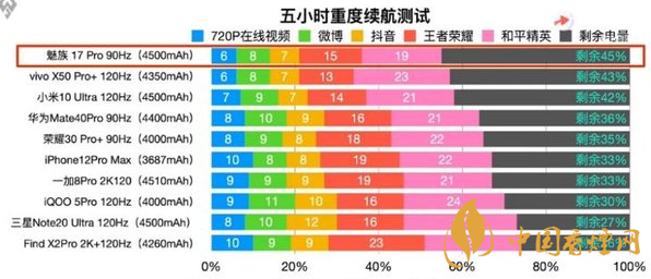 這次測評主要通過對720P在線視頻、刷微博,抖音,打王者榮耀和平精英等日常應用進行測試,得出了5G旗艦的五小時重度續航排名。其中,續航最好的機型是魅族17 Pro,經過五小時的重度測試,該機還剩下45%的電量。