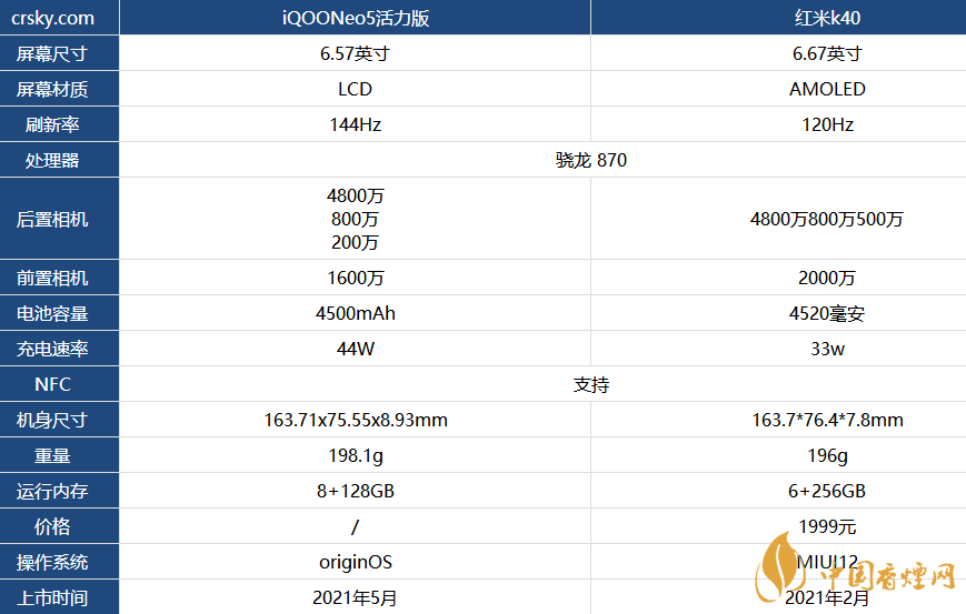 以上就是香煙網小編為大家帶來的iQOONeo5活力版和紅米k40參數對比-哪款值得買相關資訊,以上資訊全來自網絡,更多最新最實用的資訊請持續關注香煙網。