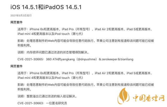 漏洞可被利用制作惡意網(wǎng)頁(yè)內(nèi)容導(dǎo)致任意代碼執(zhí)行,蘋(píng)果已在 iOS 14.5.1 系統(tǒng)上解決了該問(wèn)題。