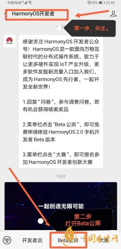 另外一種比較簡單的方法就是微信申請鴻蒙公測資格。關注HarmonyOS開發者公眾號!菜單欄點擊“Beta公測”,即可免費申請體驗HarmonyOS 2.0 手機開發者Beta版本,等待審核通過了即可。