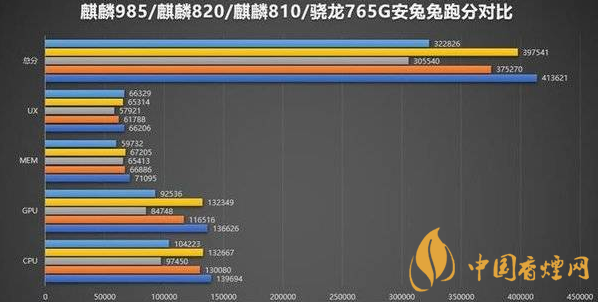 同時從麒麟985/麒麟820/麒麟810/驍龍765G安兔兔成績橫向對比圖來看