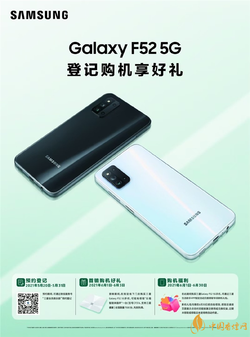 三星 Galaxy F52 5G 將于 5 月 20 日開啟國行預約,6 月 1 日正式開售,海報與真機圖已曝光。