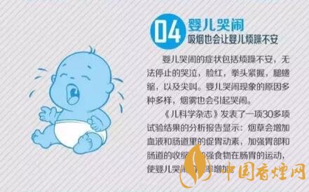 《兒科學(xué)雜志》發(fā)表了一項30多項試驗結(jié)果的分析報告顯示:煙草會增加血液和腸道里的促胃動素,加強胃8部和腸道的收縮,加強食物在腸胃的運動,使嬰兒哭鬧的概率增加。