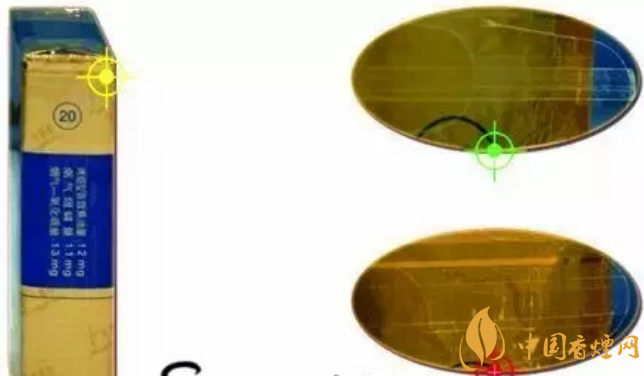 真品黃鶴樓軟藍香煙的拉絲有麻點(絲網狀的膠水痕跡),拉絲頭相對光滑規則;