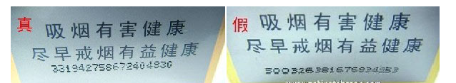 ①平放在桌上,斜角45度觀察靜止狀態下的激光全息圖案:真品卷煙圖案表面燙金平整、干凈,能照射出影像來,且無任何污垢痕跡;假冒卷煙表面印刷粗糙,能明顯看出表面定位燙金有脫皮現象,污垢痕跡明顯,表面如同銅鏡上附著一層霧氣看上去較模糊不清。