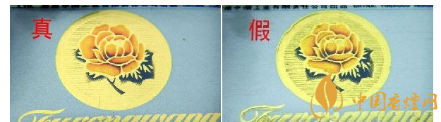 ②正面芙蓉花及拼音字母印刷:真品卷煙燙金顏色均勻一致,色差小,圖案中橫條線之間線條粗細大小相同,且表面干凈、整潔;假冒卷煙燙金套印偏差大,邊緣多出現凹凸不平現象,圖案中橫條線之間大小不一,色差較大。