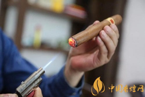 單手45°持茄,火焰正對雪茄端面,盡量靠近但不觸碰,轉動雪茄,到端部變黑即可停止,過分點燃會導致雪茄苦澀。