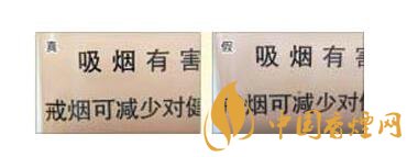 真煙警示語印刷字的邊緣干凈,商標紙底色色原點為點狀微小顆粒,印刷細膩,如警示語第一個“吸”字的最后一筆捺,起筆點是平頭狀;假煙警示語印刷字的邊緣有均勻的鋸齒狀虛邊,商標紙底色色原點為不規則的點,顆粒大,印刷不均勻且粗糙,如警示語第一個“吸”字的最后一筆捺,起筆點是尖頭狀。