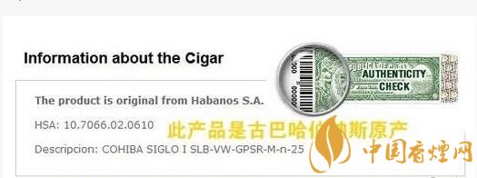 這個防偽標簽永遠是放在盒子正面的左下角,側面的的左上角。登陸古巴Hababos官網,可以看到條碼查詢入口,輸入條碼編號可以查到這樣的結果: