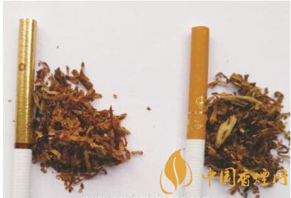 真煙煙絲切絲寬度均勻,煙絲疏松、光澤油潤性好,呈檸檬黃色,煙絲結構為純葉絲;假煙煙絲切絲寬度不勻,光澤油潤性較差,煙絲結構為葉絲和少量梗絲,與真品特征存在明顯差異。