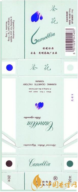 1998年昆明卷煙廠出品。“茶花”牌卷煙創牌于1975年,茶花是云南特有的名花,也是昆明市的市花。1975年昆明卷煙廠用英國引進的全國煙草行業第一臺過濾嘴卷煙設備,生產云南第1包過濾嘴香。1976年,首批銷往香港,開創中國過濾嘴卷煙出口創匯先河。