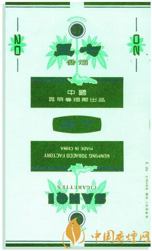 1983年昆明卷煙廠出品。主、副圖為綠色三七植株,商標簡捷、具像,主題醒目。三七為云南省著名且地道的中藥材特產,盛產于滇東文山州地區,其歷史悠久、產量大、質量好,習稱“文三七”、“田七”。