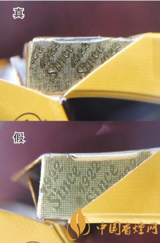 真煙側(cè)面印刷字體“since1922”字跡清晰,凹凸明顯;假煙字跡模糊,無(wú)明顯凹凸。