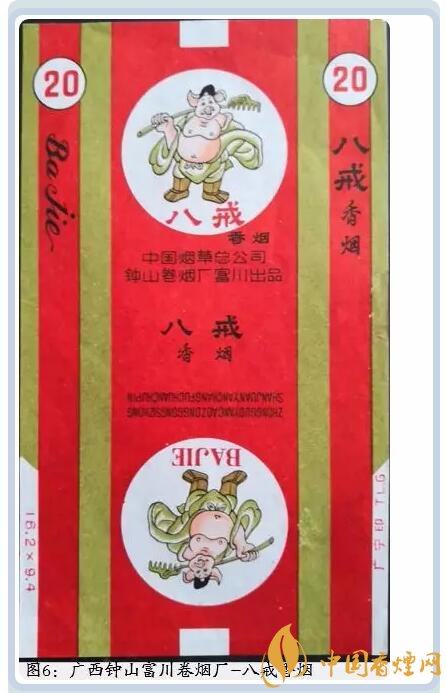 廣西鐘山富川卷煙廠生產過一款八戒香煙,圖案是豬八戒扛著釘耙開懷大笑,其腳下還標有八戒二字。