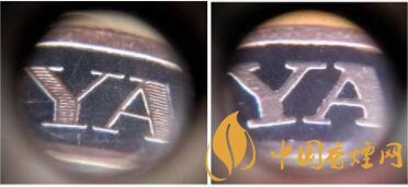 4.YUNYAN拼音字母。真品卷煙金腰帶頂部YUNYAN拼音,筆畫內有橫線條痕跡。該款假冒卷煙字母筆畫內無橫線條痕跡。圖4左真右假