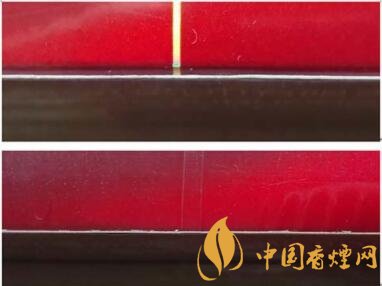 真品卷煙商標紙邊緣裁切干凈、光清,無毛邊。該款假冒卷煙商標紙邊緣裁切粗糙,毛邊多。圖6上真下假