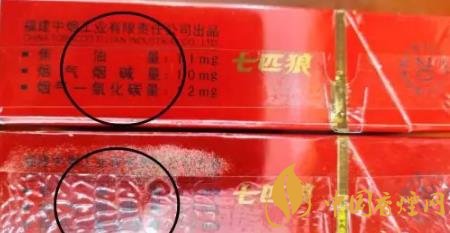 1、商標紙上的“七匹狼”商標圖案:真煙套印準確,燙金飽滿,色澤鮮亮,圖案生動,立體感強。假煙燙金套印容易出現錯位,燙金處會出現漏金現象,顏色相較真煙暗沉,立體感差。(左真右假)