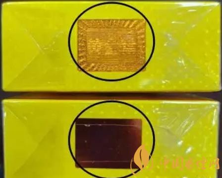 3、原產地標識:真煙筆畫較細,線條清晰,隱約可見五角星、天安門、華表。假煙筆畫較粗,出現線條黏連的現場,五角星、天安門、華表顯現效果差。(左真右假)