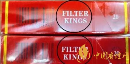 2、側面英文“FILTER KINGS”:用紫外燈照射真煙“FILTER KINGS”后,移開紫外燈,照射處字體會由黑色逐漸褪色。假煙無此效果,或變色效果差。(上真下假)
