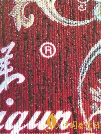 看正面注冊商標:真煙小盒正面注冊商標圖案清晰明亮,外圍輪廓柔和,為完整的圓形,無鋸齒、無斷裂;假煙小盒正面注冊商標圖案較為暗淡,外圍輪廓模糊,與背景圖案交疊錯印。