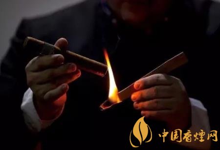 雪茄煙翻開一端(尾部)是點著的一端,不要將尾部直接放在火焰上,也不要先將雪茄放在嘴里。應當先用手拿住雪茄,將尾部以45°角接近火源一英寸處,這么做的意圖是為了預熱或是將煙灸熱以保證雪茄能充沛、均勻的點著。在灸燒時旋轉一下雪茄,當雪茄煙尾部已均勻加熱,變得焦黑和發亮時,將雪茄置入口中。