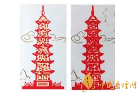 真品卷煙:紅塔印刷采用凹印,顏色交界邊緣有鋸齒痕跡;紅塔圖案紅色與淺黃色印刷清晰。