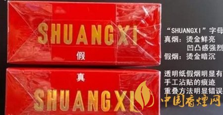 2、看小盒包裝的商標印刷工藝:尤其是“經典雙喜”這4個字,真煙筆劃清晰,字體要粗一些;而假煙的筆劃模糊,字體纖細。