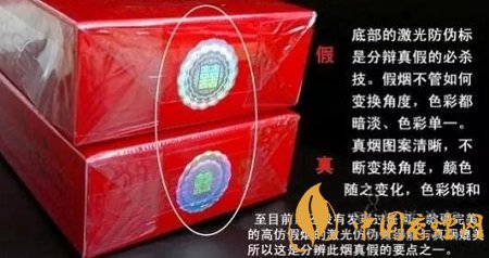 3、看底部的全息防偽標識:真煙防偽標識圖案清晰,變換角度后顏色、圖案隨之變化,色彩飽和;而假煙的防偽標識,無論怎么變換角度,色彩暗淡、單一。