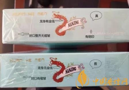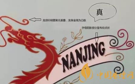 看條盒顏色,真煙為淡藍(lán)色,顏色柔和純正;假煙為淺藍(lán)色,視覺上顏色不是自然色。看條盒圖標(biāo),真煙“南京”二字字體端正清晰,龍須印刷圖案無重疊,龍身金線為凸版,條盒金邊無毛刺;假煙“南京”二字字體向左微傾,龍須有疊痕錯層,龍身顏色為褐紅色、金線為凹版,條盒金邊有毛刺。