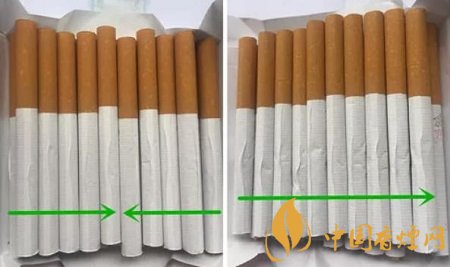 同一包卷煙內,真品卷煙煙支卷接紙有兩個相反的搭口方向;而假煙的煙支卷接紙搭口方向均為同一個朝向。