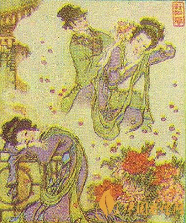 第三枚為“驚夢”,展現了杜麗娘的夢境:在牡丹盛開的涼亭下,柳生正將一朵艷麗的牡丹插戴在她的鬢間;第四枚為“寫真”,展現的是杜麗娘作自畫像的情景;第五枚為“婚走”,描繪的是柳生扶起起死回生的杜麗娘一起回家的一幕,極具浪漫主義色彩。