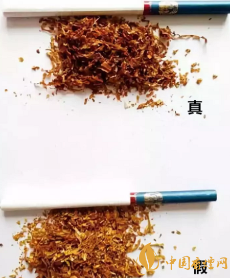 真品卷煙的煙絲由葉絲組成,煙絲切絲均勻,光澤油潤性好,碎末少,顏色為檸檬黃;假冒卷煙的煙絲由碎梗、碎絲組成,工藝粗糙,煙絲寬度不均勻、多為碎末,經硫磺熏制后呈黃白色。