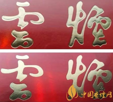 真品卷煙云煙字體燙金印刷明亮、清晰、完美。字體筆畫中間凸起,邊緣凹陷,字體飽滿,整體立體感強。側(cè)光觀察商標(biāo)紙表面呈現(xiàn)磨砂狀,紅色線條凸起。該款假冒卷煙云煙字體燙金印刷顏色暗,筆畫燙金掉金。字體筆畫整體平,無立體感,印刷較為粗糙。側(cè)光觀察商標(biāo)紙表面無磨砂狀,紅色線條平。(上真下假)