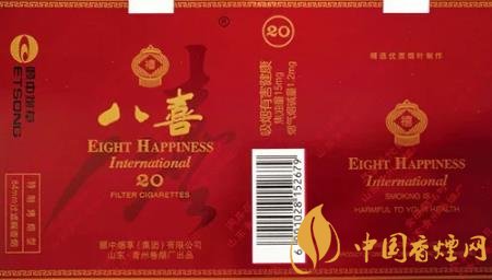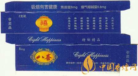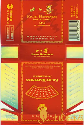 “八喜”香煙高貴典雅的煙標裝潢設計,曾獲得第八屆華東裝潢設計大獎展最佳創意獎。“八喜”香煙問世后,青州卷煙廠得知人們很想知道“八喜”具體指哪“八喜”,于是該廠于1999年向社會廣泛征集吉祥語,從中精選出“久旱逢甘霖、他鄉遇故知、洞房花燭夜、金榜題名時、升官又晉爵、財源紛紛至、家和體魄健、盡享天倫日”等八句具有代表性的吉祥語,作為“八喜”的詮釋和具體所指。