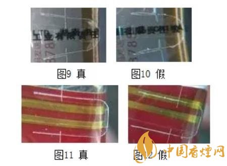 為了防范不法分子假冒而損害企業、消費者利益,卷煙生產企業采取了各種防偽技術,并利用防偽技術來打擊假冒偽劣,整頓和規范市場,提升企業及其產品形象,是一種展示企業對消費者、對社會負責任的必須手段。卷煙防偽技術是綜合應用現代科學理論與技術,在產品的商標標識上制作具有高科技含量的圖案或信息,達到難以仿制的目的。目前卷煙行業應用較多的防偽技術有激光全息防偽、彩色纖維、微縮印刷、變色油墨、超線防偽等等,且多種防偽技術結合應用,科技含量高,制作工藝復雜,假冒煙極難仿制。早期偽造的防偽標志粗糙容易識別,近些年,有些不法分子利用煙草行業防范疏漏,套取企業機密,部分假煙防偽制作逼真,難以確認。例1:云煙(軟大重九)激光全息防偽,不同的角度呈現立體雕刻的雙龍、深度云層背景與動態光芒交替變換的效果(圖3),圖4假煙雙龍立體感也非常好;例2:白沙(和天下)超細線防偽,運用線條進行防偽,有豐富的曲線、粗細、陰陽線等變化,圖5、圖6真假難辨;例3:利群(新版)菱形圓角激光全息防偽標志,標志內有廠徽及梅花圖案,在不同的角度擺動可見方形、橢圓形等多種幾何圖案,石塔下面有微縮防偽(廠長簽名),圖7、圖8亦是真假難辨。