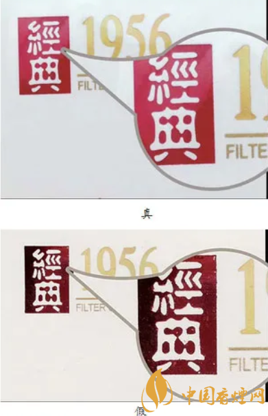 真煙條盒上的“經典”二字筆劃清晰、有立體感;假煙條盒上的“經典”二字筆劃粗糙、字跡模糊。