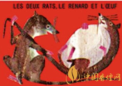 法國著名煙草經銷機構塞塔公司推出過系列伊索和拉封丹寓言卡通火花,其中的“鼠火花”內容詼諧,十分有趣。《雙鼠、狐貍和雞蛋》(圖二)讓外界不要低估老鼠的智慧。狡猾的狐貍原本認定老鼠搬不了雞蛋,不料兩個耗子狡黠協作,一個躺倒抱住雞蛋的同時直接讓伙伴拽拉著它的尾巴,彼此安然回洞!《老鼠和牡蠣》(圖三)是說被誘惑和貪婪的后果很嚴重:內陸之鼠初到海邊,看到張殼做日光浴的牡蠣新奇不已,竟一頭伸進殼中欲以秀色為餐,結果……即刻就要閉合的美艷景色不會免費啊!