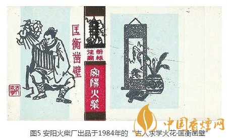上世紀(jì)80年代,安陽火柴廠出品的“古人求學(xué)”火花,再現(xiàn)了部分古代學(xué)霸身處逆境、好學(xué)不倦的形象。這套火花主版為我國(guó)傳統(tǒng)文化中的文書工具,即“文房四寶”毛筆、硯臺(tái)、墨、紙,其中紙已經(jīng)畫成了一幅精美的山水國(guó)畫,裝裱后掛在墻上,以供觀賞。主版則分別描繪了車胤束螢、黃霸讀經(jīng)、劉恕忘食、孫敬懸梁、荀淑求教、買臣負(fù)薪、鄭王辭位苦讀等古代十二位著名的讀書典范代表。其中“匡衡鑿壁”(圖5)一枚,描繪了西漢匡衡鑿穿墻壁引鄰舍之燭光,手捧竹簡(jiǎn)苦讀的形象。